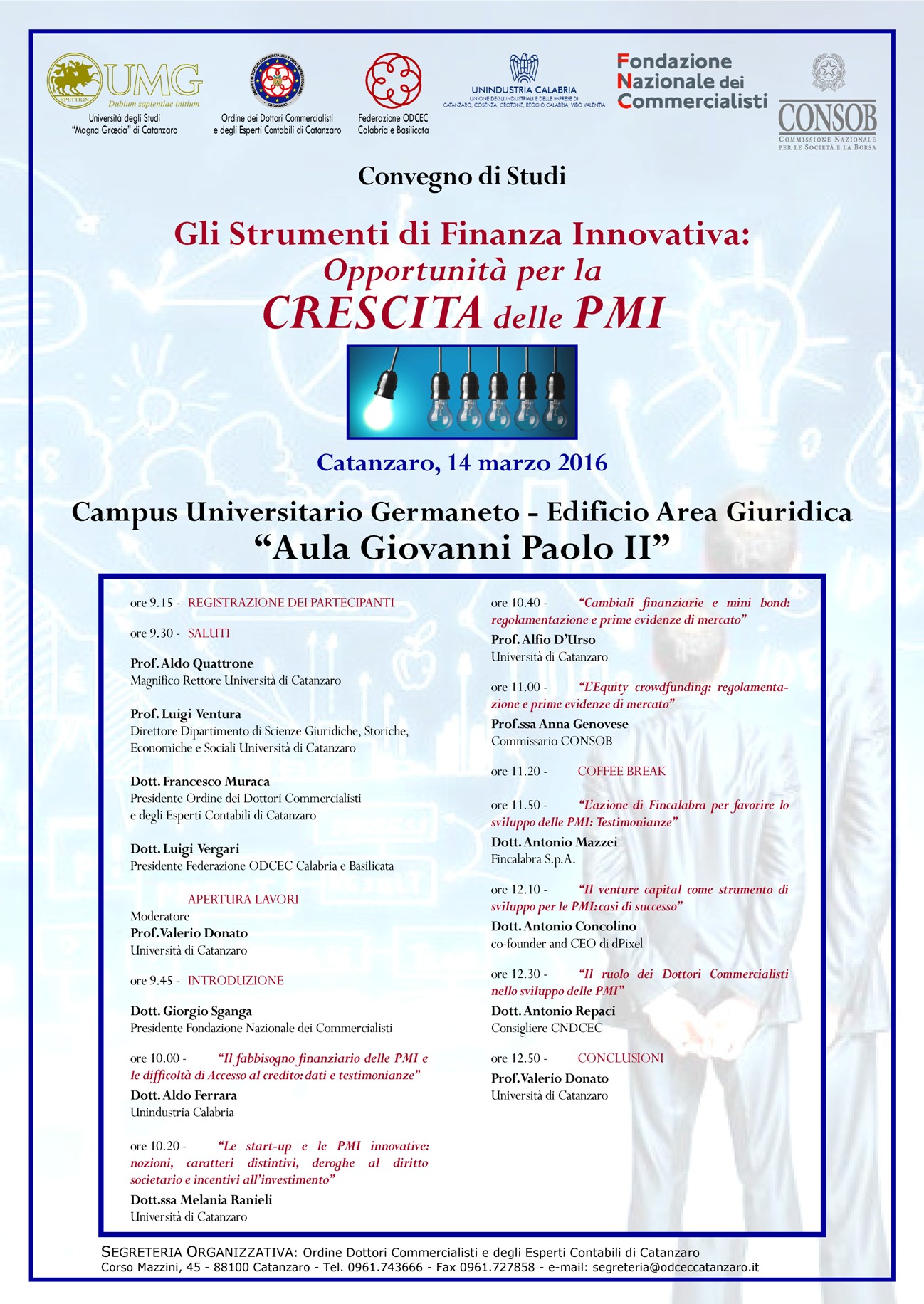 Al seminario, organizzato dall’Ordine dei Dottori Commercialisti di Catanzaro, prenderanno parte: Valerio Donato, docente dell’Università di Catanzaro; Giorgio Sganga, Presidente della Fondazione Nazionale dei Commercialisti; Aldo Ferrara di Unindustria Calabria; Melania Ranieli e Alfio D’Urso del campus universitario; Anna Genovese, Commissario CONSOB; Antonio Mazzei di Fincalabra S.p.A. e Project Manager di CalabriaInnova; Antonio Concolino, co-founder e CEO di dPixel; Antonio Repaci, Consigliere CNDCEC.
