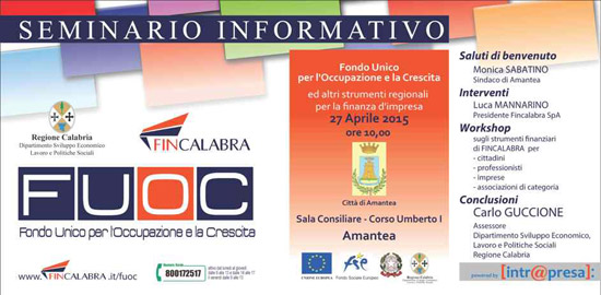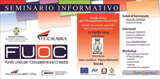 Fincalabra prosegue la propria attività informativa sui territori per portare informazione ed assistenza ai potenziali beneficari del Fondo Unico per l'Occupazione e la Crescita (FUOC), del Fondo Unico di Ingegneria Finanziaria (FUIF) e di altri strumenti finanziari.