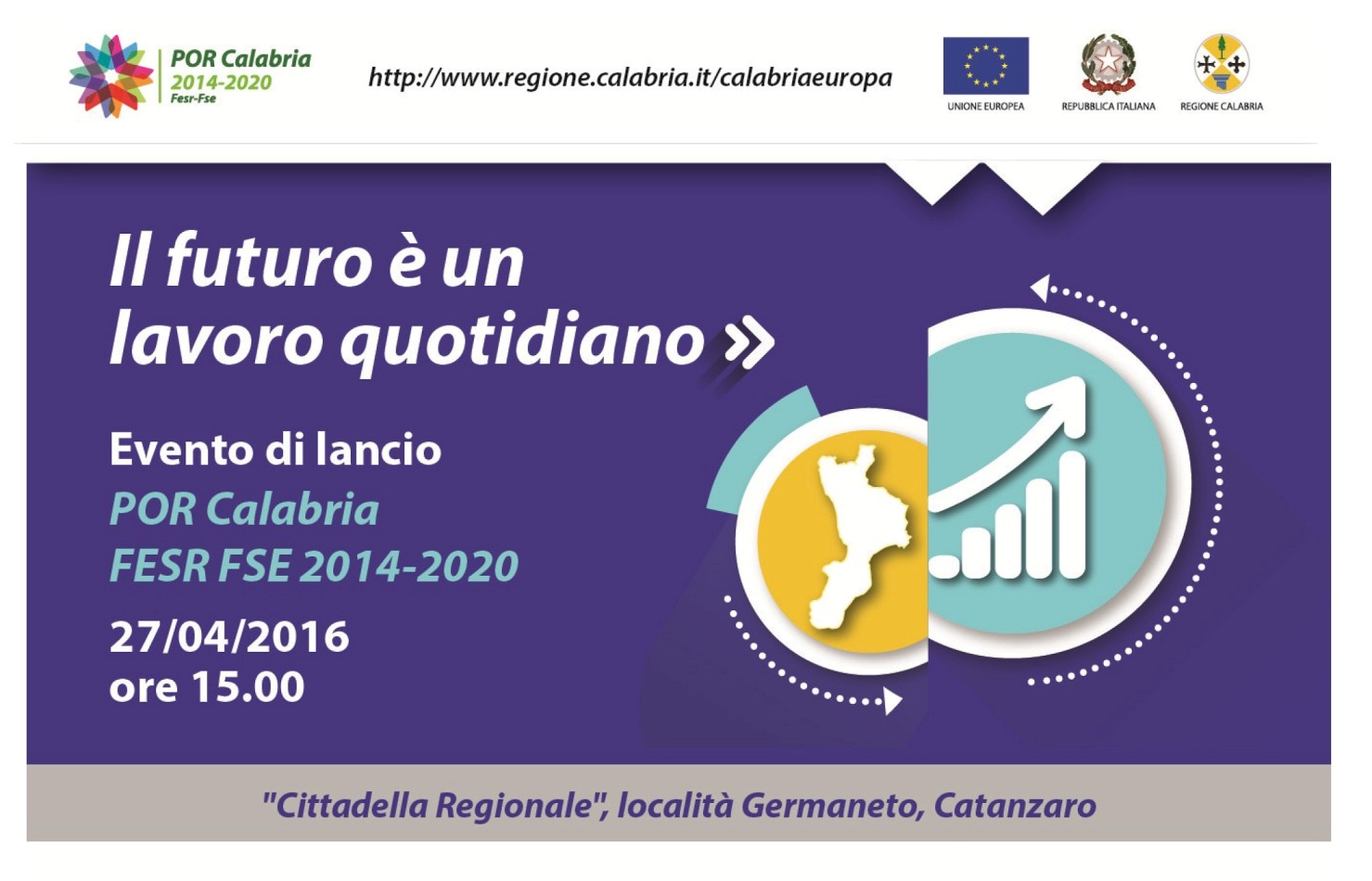 Il 27 aprile, alle 15, presso la Cittadella Regionale si terrà l’evento di lancio del POR Calabria FESR FSE 2014-2020. Il Programma Operativo Regionale può partire con i primi bandi e l’evento sarà proprio l’occasione per presentare gli obiettivi da raggiungere, il metodo di lavoro e le prime opportunità anche nel campo della ricerca e dell’innovazione.