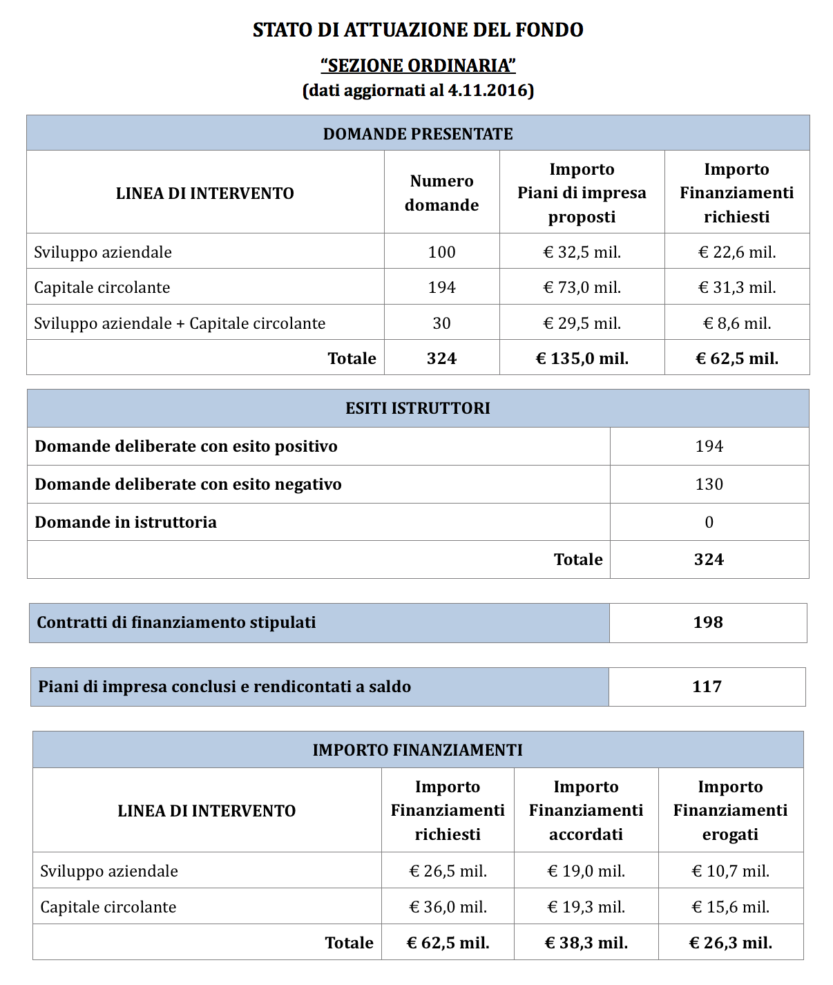 Il “Fondo Rafforzamento Imprese Esistenti”, avente una dotazione finanziaria originariamente pari ad € 27.359.000, e successivamente incrementata di ulteriori € 28.000.000 da destinare in favore di un maggior numero di imprese beneficiarie, risulta attualmente impegnato (Sezione Ordinaria + Sezione Semplificata) per un importo complessivo pari a circa € 52.000.000, e con finanziamenti accordati in favore di n. 427 imprese.