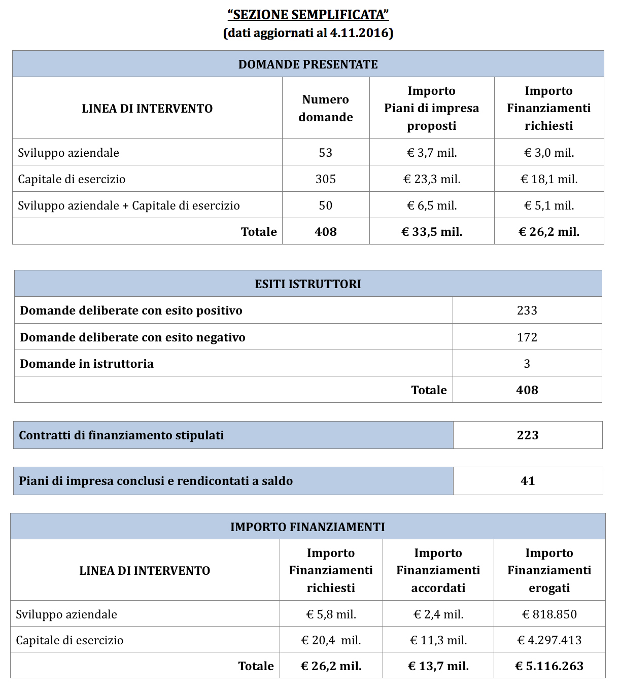 • Sezione Semplificata: Il Comitato ha proceduto all’esame di n. 40 domande di finanziamento istruite dal Soggetto Gestore, Fincalabra S.p.A., e deliberato la concessione di finanziamenti per un importo complessivo pari a circa € 1,1 milioni in favore di n. 20 imprese positivamente valutate;