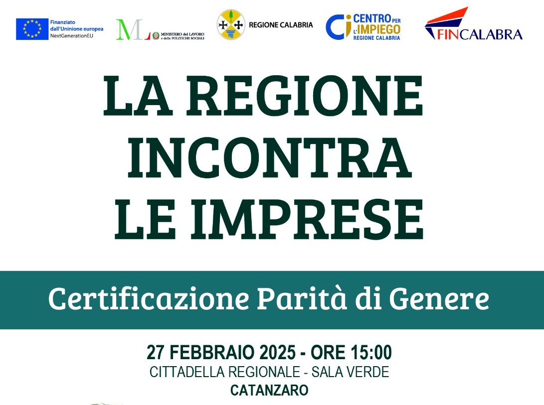 La Regione incontra le imprese e promuove un incontro formativo/informativo sulla Certificazione della Parità di Genere, intesa come opportunità volta a favorire una maggiore partecipazione delle donne al mondo del lavoro ed anche a realizzare un beneficio rivolto alle aziende, in relazione alle opportunità economiche e di sviluppo derivanti.